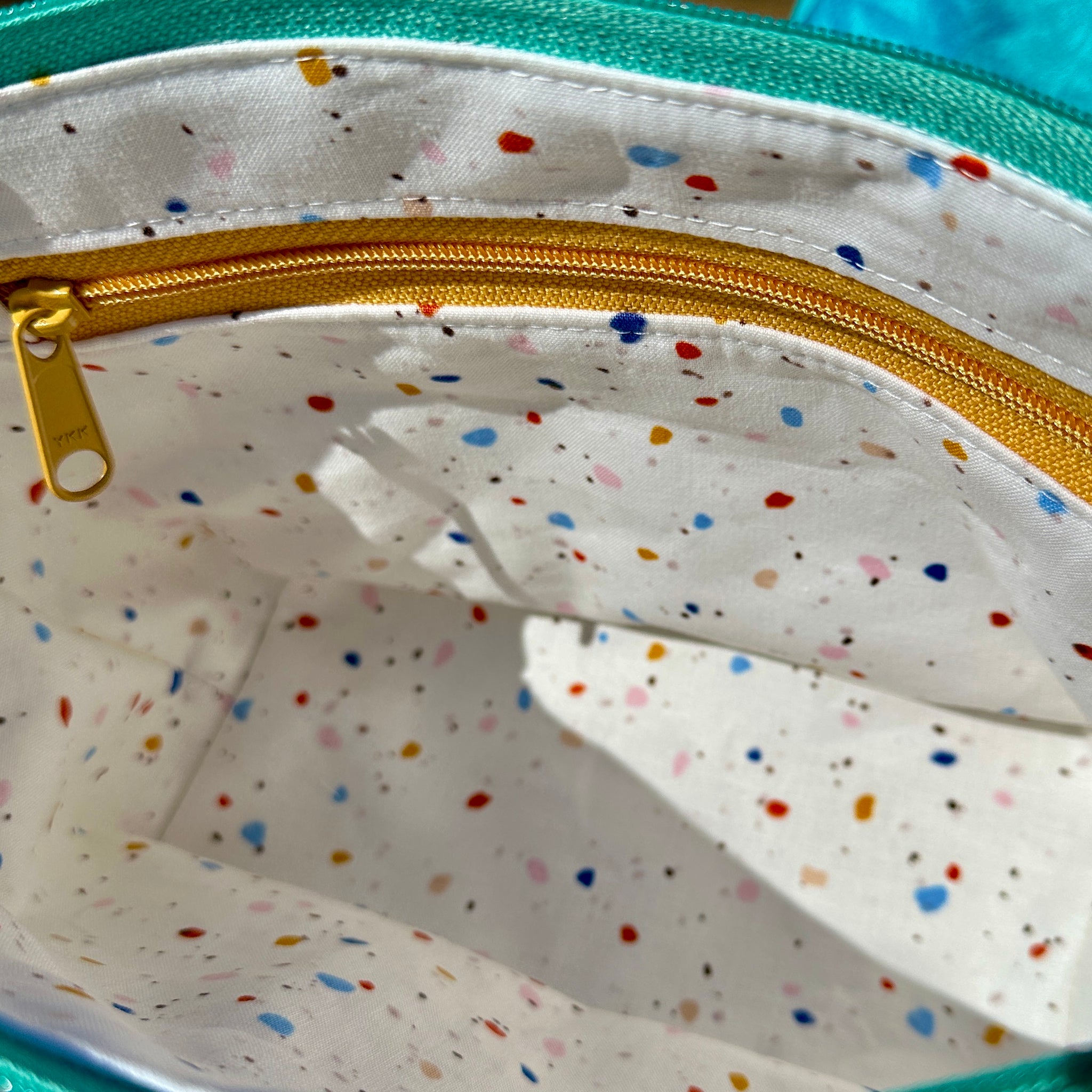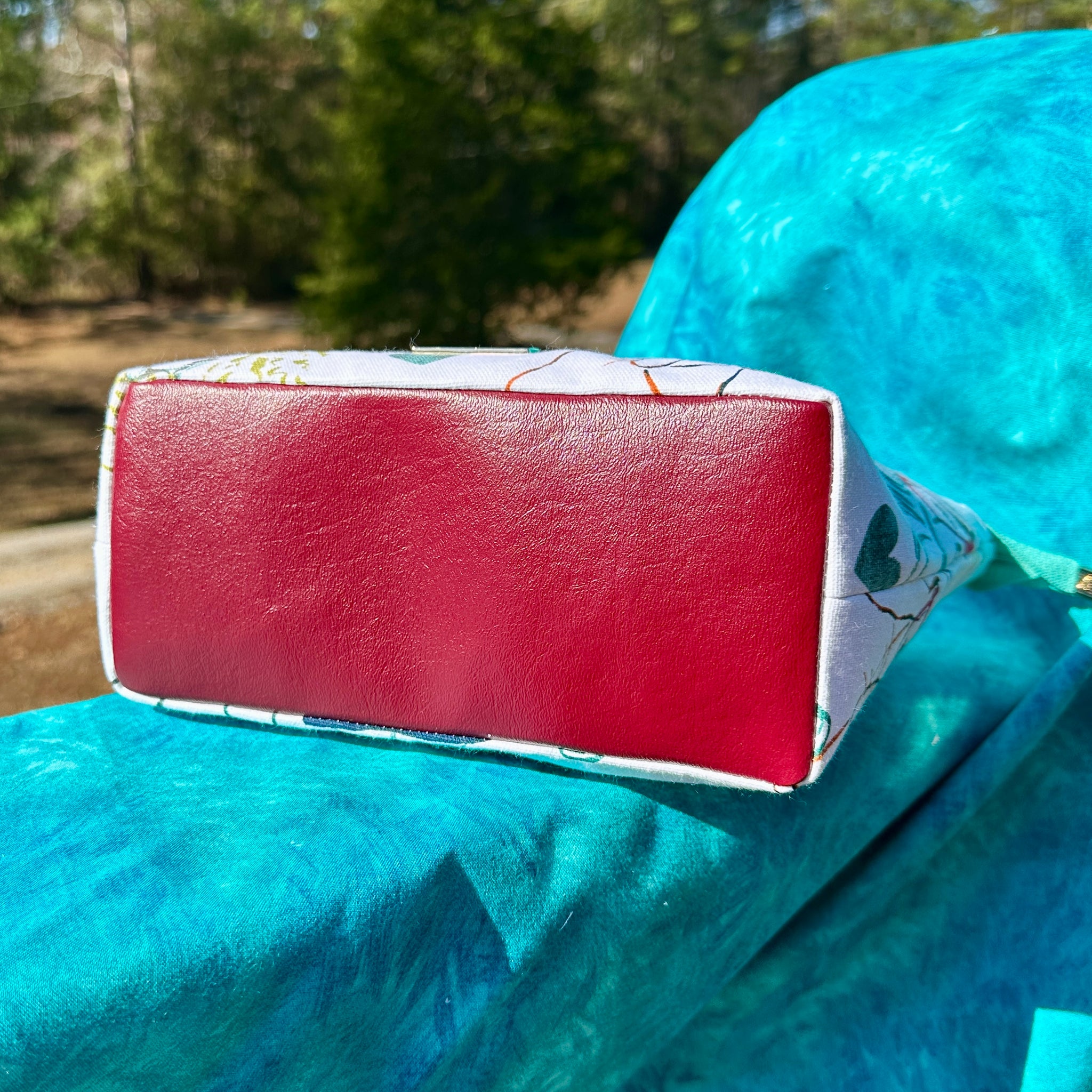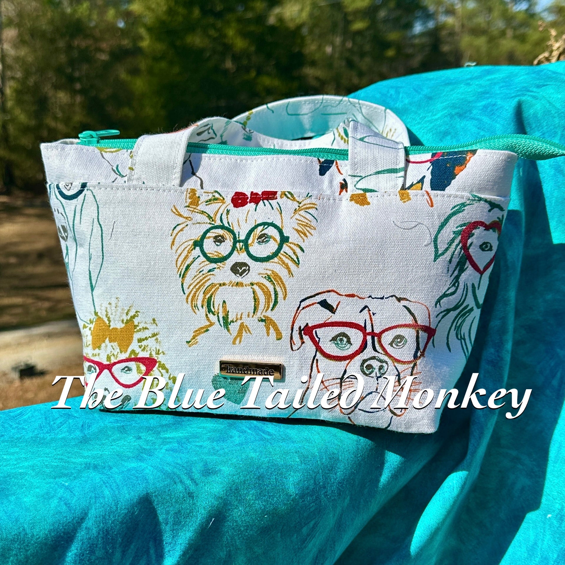 Handbag is cotton canvas and features wide open zipper top, interior zipper pocket, matching handle and burgundy vinyl bottom.Measurements are approximately:11.5" across top7" tall7.5" wide3.5" deep